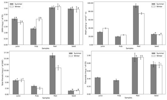 Antioxidant power essays of the different fruit parts in summer and winter: DPPH (mg·g−1 of Trolox equivalents dw), FRAP (µmol·g−1 of Fe2+ equivalents dw), Total Phenols (mg·g−1 of gallic acid equivalents dw), and Flavonoids (mg·g−1 of catechin equivalents dw). Letters indicate statistical comparisons: values with the same letter show no significant differences (p > 0.05) between summer and winter samples, as determined by a one-way ANOVA followed by a post-hoc Tukey HSD test. Numerical data can be found in Appendix A, Table A2.