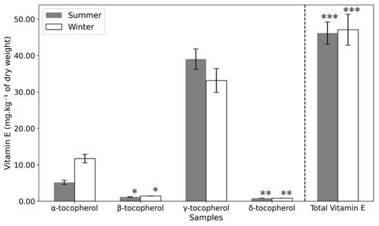 Vitamin E content of the seeds of summer and winter samples (mg·kg−1 of dry weight). Statistical significance is indicated by asterisks (*, **, ***), with p-values less than 0.05, as determined by a one-way ANOVA followed by a post-hoc Tukey HSD test.