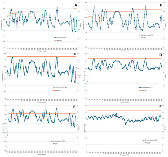 Average temperature and RH changes during the curing process: (A) FD in glass jar; (B) FD in Mylar bag; (C) Ambient air dried in glass jar; (D) Ambient air dried in Mylar bag; (E) HA in glass jar; (F) HA in Mylar bag.