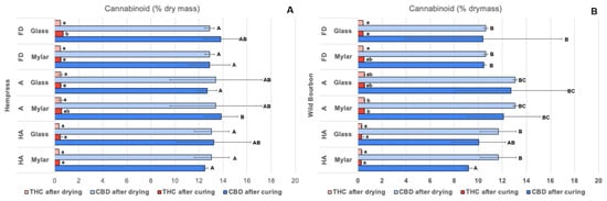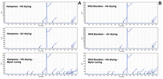 HPLC chromatography of the (A) Hempress cultivar and (B) Wild Bourbon cultivar hemp after HA drying, ambient air drying, and HA drying followed by curing in Mylar bag.
