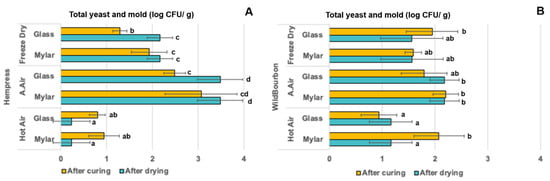 Total yeast and mold count on the hemp samples of (A) Hempress and (B) Wild Bourbon varieties after different drying and curing conditions. Same lower-case letters indicated that the mean values in the same column within the same cultivar were not significantly different (p > 0.01).