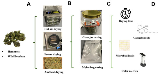 Experimental setup for hemp drying, curing, and properties analyses: (A) Freshly harvested hemp biomass; (B) Postharvest drying; (C) Postharvest curing; (D) Drying and quality analyses.