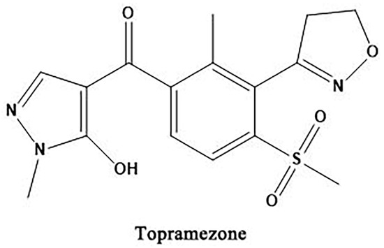 Topramezone is a 4-hydroxyphenylpyruvate dioxygenase (HPPD) inhibitor developed by BASF SE (Ludwigshafen, Germany). It is classified as a benzoylpyrazolone herbicide, with an excellent safety profile, high selectivity, broad-spectrum herbicidal activity, long-term efficacy, and better environmental compatibility for use in cornfields (Figure 1) [7]. Rice exhibits high sensitivity to topramezone. Therefore, if its application can be extended to paddy fields, it will serve as an effective tool for controlling herbicide-resistant weeds and weedy rice.
