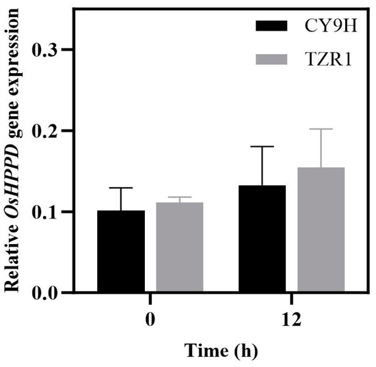 Relative expression levels of OsHPPD mRNA in CY9H and TZR1 at 0 and 12 h after topramezone treatment (FC < 2, p > 0.05, n = 6). Data are presented as the mean ± standard error (SE).