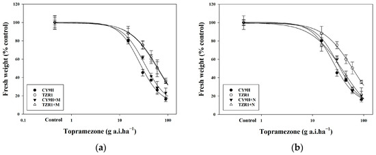 Dose–response curves of CY9H and TZR1 to topramezone. Topramezone was applied at 0, 15, 30, 45, 60, and 90 g a.i. ha−1 (n = 108): (a) response of CY9H and TZR1 to topramezone after treatment with the CYP450 inhibitor malathion (M, 1000 g a.i. ha−1); and (b) response of CY9H and TZR1 to topramezone after treatment with the GST inhibitor NBD-Cl (N, 270 g a.i. ha−1). Data are expressed as mean ± standard error (SE).