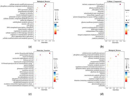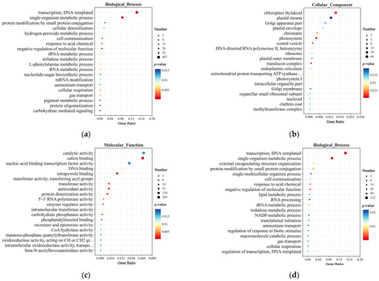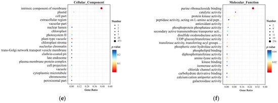 GO enrichment analysis of DEGs in CY9H and TZR1 at 0 and 12 h after topramezone treatment: (a) GO enrichment analysis of Biological Process at 0 h; (b) GO enrichment analysis of Cellular Component at 0 h; (c) GO enrichment analysis of Molecular Function at 0 h; (d) GO enrichment analysis of Biological Process at 12 h; (e) GO enrichment analysis of Cellular Component at 12 h; and (f) GO enrichment analysis of Molecular Function at 12 h. The enrichment analysis yielded the top 20 pathways ranked by the lowest p-values, ordered in ascending Gene Ratio.