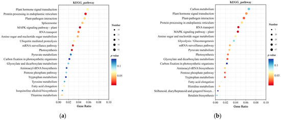 KEGG enrichment analysis of DEGs in CY9H and TZR1 at 0 h and 12 h after topramezone treatment: (a) KEGG enrichment analysis at 0 h; and (b) KEGG enrichment analysis at 12 h. The enrichment analysis yielded the top 20 pathways ranked by the lowest p-values, ordered in ascending Gene Ratio. There is a positive correlation between the size of the bubble and the number of DEGs. The transition from blue to red via a bubble gradient indicates significant enhancement.