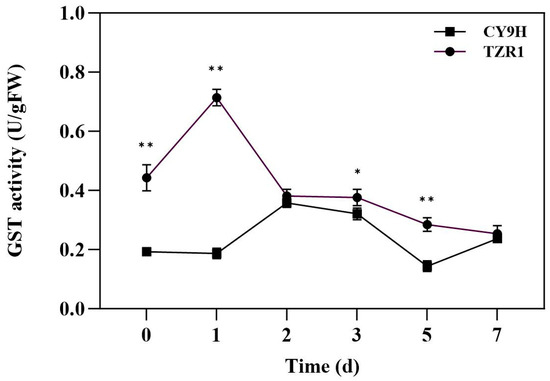 GST activity in CY9H and TZR1 at different days after topramezone treatment (n = 3). Topramezone was applied at 45 g a.i. ha−1. Data are expressed as the mean ± standard error (SE) from three biological replicates. Asterisks indicate significant differences of the GST activity in CY9H and TZR1 (* p < 0.05, ** p < 0.01).