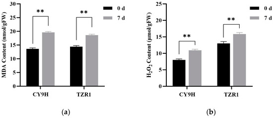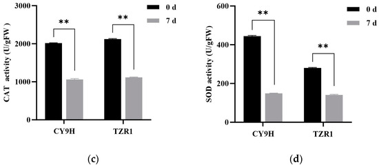 Redox-related enzyme activities in CY9H and TZR1 at 0 and 7 d after topramezone treatment: (a) MDA content; (b) H2O2 content; (c) CAT enzyme activity; and (d) SOD enzyme activity (n = 3). Topramezone was applied at 45 g a.i. ha−1. Data are expressed as the mean ± standard error (SE) from three biological replicates. Asterisks indicate significant differences in redox-related enzyme activities in CY9H and TZR1 (** p < 0.01).