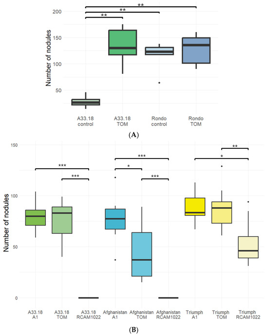 Nodulation phenotype of A33.18 line. (A)—nodulation in non-sterile soil (control and inoculation with TOM (nodX+) strain) (n = 6); (B)—nodulation in sterile sand (inoculation with RCAM 1022 (nodX−), TOM (nodX+), and A1 (nodX+) strains (n ≥ 5). *—p-value < 0.05, **—p-value < 0.01, ***—p-value < 0.001.