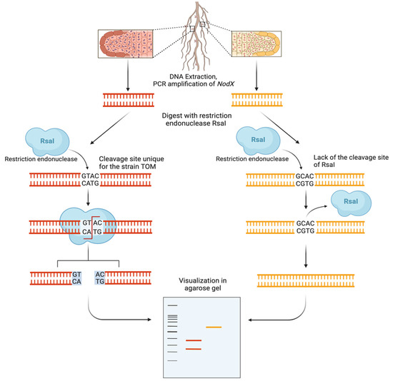 Taking this into account, we developed a PCR-based marker distinguishing the alleles of the nodX gene after endonuclease RsaI digest. We designed the pair of primers specific to nodX of both TOM and A1 (but not to other rhizobial nodX sequences) and selected the endonuclease RsaI that recognizes the GATC site, which is present only in TOM’s but not in A1′s nodX gene sequence due to a single-nucleotide polymorphism (Figure 4). An example on agarose gel is given in Figure S3.