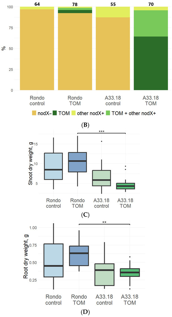Nodulation and growth parameters of A33.18 and cv. ‘Rondo’ in the field experiment. (A)—nodulation (control and inoculation with TOM (nodX+) strain) (n ≥ 11), (B)—distribution of nodules formed by nodX− and nodX+ strains (the number of examined nodules is given above the columns), (C)—shoot dry weight (n ≥ 11), and (D)—root dry weight (n ≥ 11). **—p-value < 0.01, ***—p-value < 0.001.