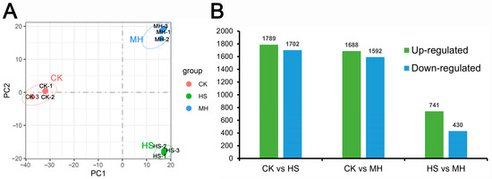 To uncover the potential regulatory mechanisms underlying melatonin-mediated responses to heat stress, RNA sequencing was conducted on nine samples (three biological replicates per group): seedlings subjected to heat stress alone (HS), seedlings pre-treated with melatonin before heat stress (MH), and a control group (CK). The sequencing generated 18.23–23.80 million raw reads per sample, totaling 181.7 million reads, with an average mapping rate of 84.99% to the reference genome [11] (Table S1). Principal component analysis (PCA) showed clear separation among the three groups, indicating distinct transcriptomic responses, with replicates clustering tightly within each group (Figure 1A).
