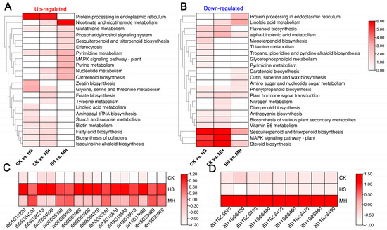 KEGG enrichment analysis of DEGs in pairwise comparison. (A) KEGG enrichment analysis of up-regulated DEGs across pairwise comparisons. (B) KEGG enrichment analysis of down-regulated DEGs across pairwise comparisons. (C) Heatmap showing the RNA profiles of genes involved in the enriched KEGG pathway “Zeatin biosynthesis” across the CK, HS, and MH treatment. (D) Heatmap showing the RNA expression profiles of genes involved in the enriched KEGG pathway “Nicotinate and nicotinamide metabolism” across CK, HS, and MH treatments. The color bar represents the Z-scores after normalization.