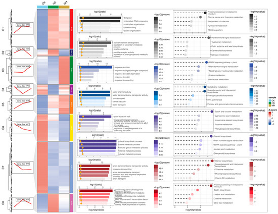 Clustering and functional enrichment analysis of DEGs under different treatments. The heatmap shows the Z-scores of DEGs across CK (control), HS (heat stress), and MH (melatonin under heat stress) treatments. DEGs are grouped into eight clusters (C1–C8) based on expression patterns, with the number of genes in each cluster indicated. Line plots on the left depict the expression trends for each cluster. Functional enrichment analysis for each cluster is presented on the right, with bar charts showing the log10(ratio) of enriched GO terms and KEGG pathways, while bubble plots represent the corresponding −log10(p-value) for significant terms. Key biological processes and pathways relevant to each cluster are highlighted, reflecting their functional significance under the treatments.