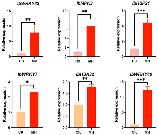 To verify the reliability of our transcriptomic data and further investigate the role of exogenous melatonin in enhancing heat tolerance in sweet potato, we conducted qPCR analysis on several genes with higher expression ratios in the HS vs. MH and CK vs. MH groups. The selected genes included WRKY transcription factors, such as IbWRKY33 (IB06G19780), IbWRKY7 (IB01G10370), and IbWRKY40 (IB08G11330); heat shock proteins like IbHSP21 (IB12G21990); the heat stress-associated gene IbHSA32 (IB11G34820); and the MAP kinase gene IbMPK3 (IB03G06030) (Table S6, Figure 5). The qPCR results revealed expression patterns that were consistent with those observed in the transcriptomic analysis, further corroborating the accuracy and reliability of the RNA-seq data. These findings provide additional validation for the gene expression trends identified in our study and highlight the potential roles of these genes in melatonin-mediated heat stress tolerance.
