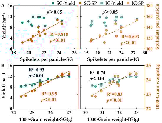 Relationship between the spikelets per panicle and yield (A) and 1000-grain weight and yield (B). SG and IG represent superior grain and inferior grains, respectively; when p > 0.05, the fitting model cannot provide statistical significance evidence, so there are no invalid fitting lines in the figures; R2 represents coefficient of determination.