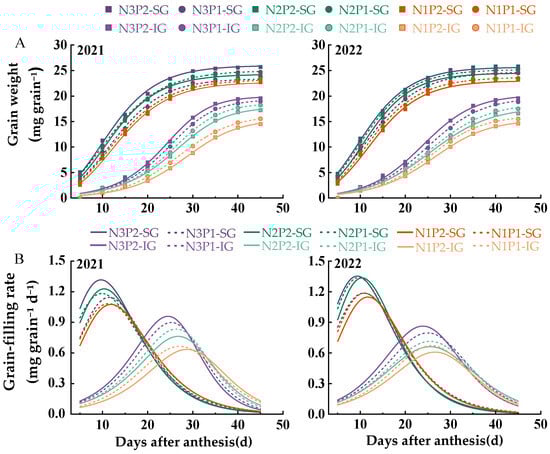 Different levels of N and P affected the filling parameters of SGs and IGs (Table 1). N3P2 led to the highest R0 for SGs, with a 72.5% increase over N3P1 in the two-year average. Similarly, the R0 of N2P1 was slightly lower than that of N3P2, with a 35.41% increase over that of N2P2. The N1 level decreased the R0 of SGs, especially in N1P2. For IGs, R0 followed the order N3 > N2 > N1. At the N3 level, P2 exceeded P1. However, this trend was reversed at the N2 and N1 levels. A reduction in N levels decreased Gmax, weight at Gmax (Wmax), and Gmean in both SGs and IGs while prolonging Tmax.G and D. In SGs, at N3 level, P1 decreased Gmax, Wmax, and Gmean but increased Tmax.G and D by approximately 1.47–1.83 and 1.13–2.83 d, respectively. At the N2 level, Gmax, Wmax, and Gmean were slightly lower for P1 than for P2; however, Tmax.G was reduced by 0.51–0.78 d while D was prolonged by approximately 0.67–2.01 d, and there were minimal differences in these parameters between N1P1 and N1P2. Regarding IGs, Gmax, Wmax, and Gmean were the highest in N3P2, followed by N3P1. In addition, Tmax.G and D were shortened by approximately 0.75–1.09 and 1.02–1.98 d in N3P2 compared to N3P1. At the N2 and N1 levels, Gmax, Wmax, and Gmean were higher for P1 than for P2, with little difference in Tmax.G and D between the two treatments. The Gmax, Wmax, and Gmean values of N2P2 were slightly lower than those of N3P2 and N3P1. However, Tmax.G was prolonged by 0.70–1.06 d compared to that of N3P2.