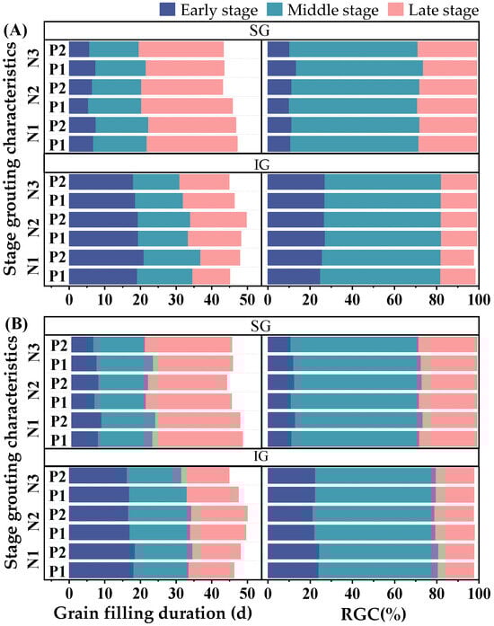 Effects of nitrogen–phosphorus interaction on characteristics of grain filling in the early, middle, and late growth stages ((A)—2021, (B)—2022). N3, N2, and N1 represent N application of 210, 178.5, and 147 kg ha−1, respectively; P2 and P1 represent P application of 105 and 73.5 kg ha−1, respectively; RGC, the grain-filling contribution rate; SG, superior grains; IG, inferior grains.