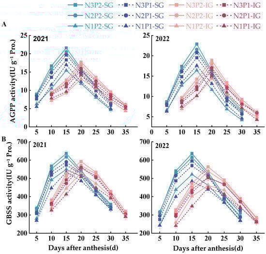 Effects of nitrogen–phosphorus interaction on the enzyme activities of ADP glucose pyrophosphorylase (AGPP) and granule-bound starch synthase (GBSS) in SGs and IGs during the filling stage ((A)—AGPP, (B)—GBSS). N3, N2, and N1 represent N application of 210, 178.5, and 147 kg ha−1, respectively; P2 and P1 represent P application of 105 and 73.5 kg ha−1, respectively.