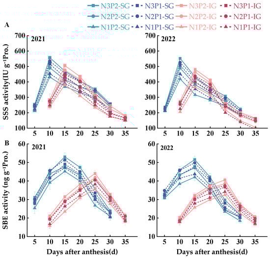 Effects of nitrogen–phosphorus interaction on the enzyme activities of soluble starch synthase (SSS) and starch branching enzyme (SBE) in SGs and IGs during the filling stage ((A)—SSS, (B)—SBE). N3, N2, and N1 represent N application of 210, 178.5, and 147 kg ha−1, respectively; P2 and P1 represent P application of 105 and 73.5 kg ha−1, respectively.