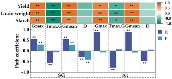 The responses of the grain-filling characteristics to N and P and their correlations with the starch content, grain weight, and yield were analyzed (Figure 7). For SGs, N and P levels showed significant positive effects on the Gmax and Gmean in SGs (path coefficients of 0.55 and 0.29, respectively), but had significant negative effects on the D. Tmax.G was significantly negatively influenced by N level alone. Moreover, Tmax.G showed a significant negative correlation with starch content, grain weight, and yield.