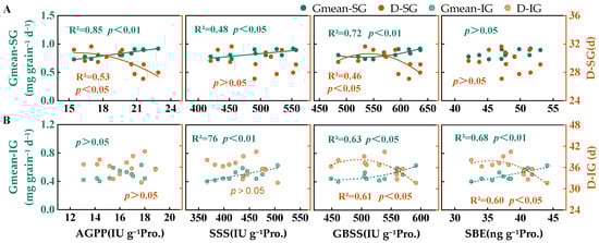Correlation between the peak activities of AGPP, SSS, GBSS, and SBE with the mean grain-filling rate (Gmean) and active grain-filling period (D) ((A)—Superior grains, SG; (B)—Inferior grains, IG). When p > 0.05, the fitting model cannot provide statistical significance evidence, so there are no invalid fitting lines in the figures; R2 represents coefficient of determination.