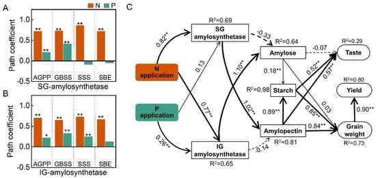 Structural equation model analysis (SEM) showing the effects of nitrogen and phosphorus on starch synthase activity, starch content, taste value, 1000-grain weight, and yield (C), path coefficient of SG (A) and path coefficient of IG (B). The R2 values denote the proportions of variance explained by relationships with other variables in SEM. Single-headed arrows indicate the hypothesized direction of causation. Indicated values denote the standardized path coefficients of a positive (positive values) or negative (negative values) effect. Solid and dashed lines represent positive and negative paths, respectively. The thickness of the black line indicates the strength of the causal relationship. * and ** represent p < 0.05 and p < 0.01, respectively.