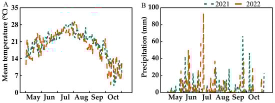 Mean temperature (A) and precipitation (B) during the rice growing seasons of 2021 and 2022.