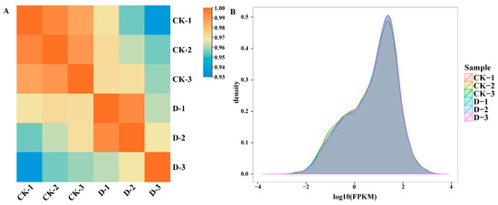 Previous experimental results indicated that treatment with 0.1 mg/L DIMBOA significantly promoted cell proliferation and the formation of globular embryos (GEs) during the early SE process [25]. To explore the molecular mechanisms underlying DIMBOA-induced promotion of somatic embryogenesis in longan, this study collected longan embryogenic cultures treated with 0.1 mg/L DIMBOA (denoted as D) and the control group (the check denoted as CK), and constructed six mRNA libraries. After quality control of the raw transcriptome sequencing data, a total of 41.60 Gb of valid data was obtained, with each sample providing more than 6.17 Gb of effective data. The GC content of the clean reads ranged from 43.80% to 44.13%, and the percentage of Q30 bases was over 96.07% for all samples. After aligning the effective data from all samples to the reference genome, the transcriptome data covered more than 95.43% of the reference genome, indicating high coverage and reliability of the sequencing data, making them suitable for subsequent experimental analysis. Pearson correlation coefficients were used to evaluate the biological reproducibility of the transcriptome data. The results showed that the biological replicates within the same group had a higher correlation, with r > 0.93 (Figure 1A). In addition, the FPKM value distribution for the samples within each group was similar (Figure 1B), depicting good reproducibility of the transcriptome sequencing results for the three biological replicates. Based on the alignment results, 2268 new genes were speculated, of which 929 were functionally annotated.