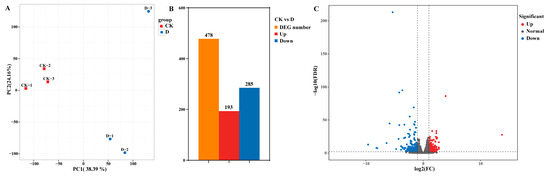 PCA (Principal Component Analysis) results showed a clear separation between the check and DIMBOA-treated groups (Figure 2A), indicating that the gene expression patterns in longan embryogenic cultures were significantly altered following DIMBOA treatment. DEGs were selected based on the criteria of |log2 (fold change)| > 1 and FDR < 0.01. We identified a total of 478 DEGs in this study, out of which 193 genes were upregulated and 285 genes downregulated (Figure 2B,C). The results suggest that after DIMBOA treatment of longan embryogenic callus (EC), the number of downregulated genes was higher than the number of upregulated genes.