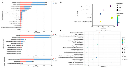 To further investigate the functions of the DEGs, GO (Gene Ontology) analysis was performed (Figure 3A, Supplementary Table S1). The results showed that the DEGs were primarily associated with biological processes (BPs), molecular functions (MFs), and cellular components (CCs). After DIMBOA treatment of longan ECs, in the BP category, DEGs were enriched in 14 GO terms, mainly focusing on metabolic process, cellular process, response to stimulus, biological regulation, and localization. In the MF category, DEGs were enriched in 10 GO terms, with a primary focus on binding, catalytic activity, and transporter activity. In the CC category, DEGs were enriched in three GO terms, named cellular anatomical entity, intracellular, and protein-containing complex. Moreover, after DIMBOA treatment, five specific GO terms exhibited significant changes: cellular response to phosphate starvation, heme binding, peroxidase activity, pectin catabolic process, and response to oxidative stress (Figure 3B). These findings suggest that DIMBOA treatment significantly affects various biological functions and processes in longan embryogenic cultures, especially those affiliated with metabolism, stress response, and enzymatic activity.