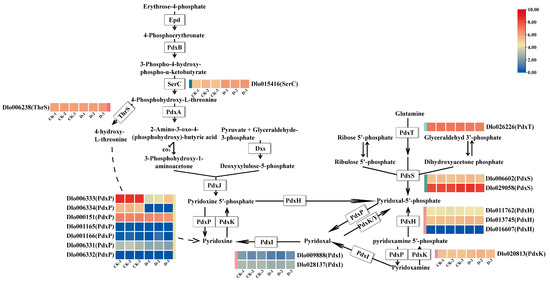 Expression profiles of key structural genes in the VB6 biosynthesis pathway of D. longan. Structural genes in each catalytic step are labeled in white boxes. Enzymes: Dxs, 1-deoxyxylulose 5-phosphate synthase; Epd, erythrose 4-phosphate dehydrogenase; PdxA, 4-phosphohydroxy-L-threonine dehydrogenase; PdxB, 4-phosphoerythronate dehydrogenase; PdxH, PNP oxidase; PdxJ, PNP synthase; PdxK, PN, PL, and PM kinase; PdxP, pyridoxal phosphate phosphatase; PdxS, PLP synthase subunit; PdxT, glutaminase subunit (PdxS and PdxT form the PLP synthase complex); PdxY, pyridoxal kinase; pdxI, pyridoxine 4-dehydrogenase; ThrS, threonine synthase; SerC, 3-phosphoserine aminotransferase. Gradient colors for each gene represent gene expression levels [normalized using log2 transformation (FPKM + 1). CK is an abbreviation for the check.