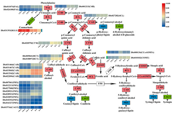 Expression profiles of differentially expressed genes in the phenylpropanoid biosynthesis pathway of D. longan. The structural genes in each catalytic step are labeled in the box, with red indicating significant upregulation, green indicating significant downregulation, and blue indicating both significant upregulation and significant downregulation. Enzymes: PAL, phenylalanine ammonia lyase; C4H, cinnamate 4-hydroxylase; 4CL, 4-coumarate-CoA ligase; BGLU, beta-glucosidase; HCT, hydroxycinnamoyl-CoA shikimate transferase; CAD, cinnamyl alcohol dehydrogenase; COMT, caffeic acid 3-O-methyltransferase; CCoAOMTs, caffeoyl CoA O-methyltransferases; PRX, peroxidases; CAGT, coniferyl alcohol glucosyltransferase; C3′H, cinnamoyl ester 3′-hydroxylase. Gradient colors for each gene represent gene expression levels [normalized using log2 transformation (FPKM + 1). CK is an abbreviation for the check.