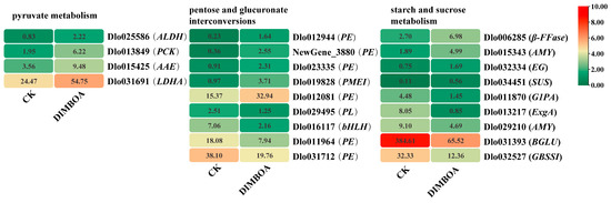 In total, three pathways of carbohydrate metabolism were enriched: pyruvate metabolism, pentose and glucuronate interconversions, and starch and sucrose metabolism. After DIMBOA treatment, pyruvate metabolism was significantly changed as compared to the check group. Based on the transcriptome sequencing annotation results, a total of 150 genes in longan were annotated to the pyruvate metabolic pathway, including 4 DEGs. Among these, 49 genes exhibited low or no expression in this pathway. Additionally, 38 genes were found to be downregulated, while 63 genes showed upregulation in the pyruvate metabolic pathway. Among them, ALDH (Aldehyde dehydrogenase) (Dlo025586), PCK (Phosphoenolpyruvate carboxykinase) (Dlo013849), AAE (acyl-activating enzyme) (Dlo015425), and LDHA (Lactate dehydrogenase A) (Dlo031691) were significantly upregulated in the pyruvate metabolism pathway. Consequently, all DEGs in the pyruvate metabolic pathway exhibited upregulated expression, which may influence the accumulation of pyruvate in longan embryogenic cultures. These findings indicate significant transcriptional alterations in genes associated with pyruvate metabolism in response to DIMBOA treatment, which may contribute to the observed physiological and biochemical responses in longan embryogenic cultures. In addition, a total of 428 genes in longan were annotated to the pentose and glucuronate interconversion pathway, among which 272 genes showed very low or no expression. Of the remaining genes, 77 were downregulated, and 79 were upregulated. Notably, in this pathway, four DEGs were downregulated, and five DEGs were upregulated following DIMBOA treatment. In the starch and sucrose metabolism pathway, 510 genes were annotated, with 173 showing very low or no expression. Among the expressed genes, 140 were downregulated, and 197 were upregulated. It is noteworthy that the starch and sucrose metabolism pathway included four upregulated DEGs and six downregulated DEGs after DIMBOA treatment. These findings propose significant regulatory effects of DIMBOA on carbohydrate metabolism pathways in longan embryogenic cultures (Figure 6, Supplementary Table S3).