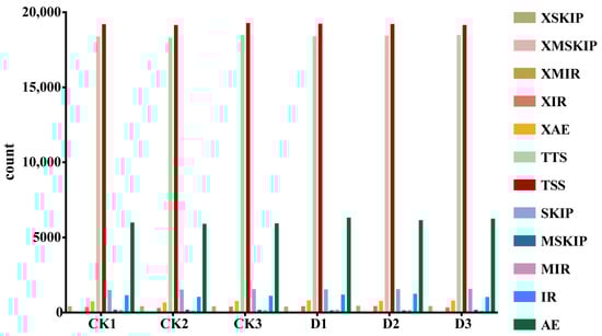 Alternative splicing events in longan embryogenic cultures after DIMBOA treatment. TSS, transcript start site. TTS, transcript end site. IR, intron retention. AE, alternative exon end. SKIP, skipped exon. XIR, IR-like. XAE, AE-like. XSKIP, SKIP-like. MIR, multi-IR. XMIR, MIR-like. MSKIP, multi-exon SKIP. XMSKIP, MSKIP-like. CK is an abbreviation for the check.