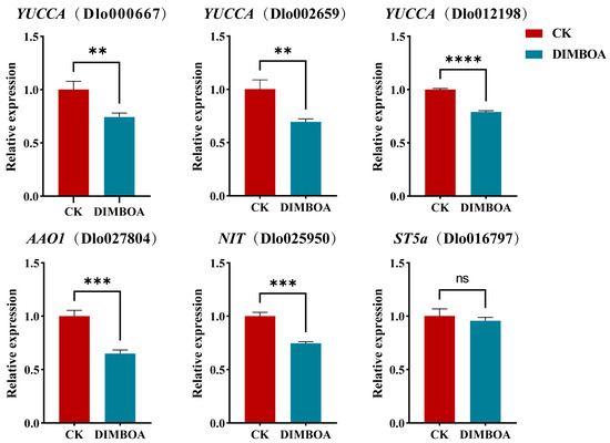 Previous studies have shown that exogenous DIMBOA treatment affects the accumulation of endogenous IAA in longan EC [25]. To further enquire whether exogenous DIMBOA influences endogenous auxin biosynthesis, our laboratory conducted transcriptome analyses based on second-generation sequencing of early SE in longan. The results indicated that key genes in the IAA biosynthesis pathway, including YUCCA (Dlo_013505.1, Dlo_027234.1, Dlo_024140.1), AAO1 (Dlo_016663.1), NIT (Dlo_032471.1), and ST5a (Dlo_007467.1), were significantly expressed during early SE in longan. In this study, based on the third-generation genome of longan, local BLAST analyses were performed to study the expression of the homologous genes YUCCA (Dlo000667, Dlo002659, Dlo012198), AAO1 (Dlo027804), NIT (Dlo025950), and ST5a (Dlo016797) under exogenous DIMBOA treatment. The results (Figure 9) showed that after DIMBOA treatment, the expression of key genes in the IAA biosynthesis pathway was generally downregulated in comparison to the check. Notably, all genes except ST5a (Dlo016797) were significantly downregulated. These findings suggest that DIMBOA influences the accumulation of endogenous IAA by regulating the expression of key genes involved in IAA biosynthesis.