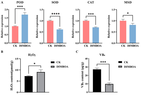 VB6 content, H2O2 content, and the expression of ROS-related genes. (A) Expression level of ROS-related genes; (B) H2O2 content; (C) VB6 content. An asterisk indicates distinctiveness (* p ≤ 0.05, *** p ≤ 0.001 and **** p ≤ 0.0001). CK is an abbreviation for the check.