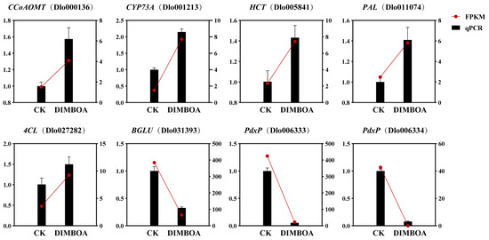 To validate the reliability of transcriptome expression data, eight genes were randomly selected from DEGs in key metabolic pathways for qRT-PCR analysis, including CCoAOMT (Dlo000136), C4H (Dlo001213), HCT (Dlo005841), PAL (Dlo011074), 4CL (Dlo027282), BGLU (Dlo031393), and PdxP (Dlo006333 and Dlo006334). The qRT-PCR results showed that the expression patterns of these eight genes were generally consistent with the transcriptome data (Figure 11), confirming the high reliability of the transcriptome analysis.