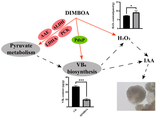 In this study, we found that the VB6 metabolic pathway was significantly enriched during DIMBOA-induced SE in longan. Therefore, we measured the VB6 content in longan embryogenic cultures (Figure 10C). The results showed that compared to the control group, VB6 content in the treatment group was significantly reduced.