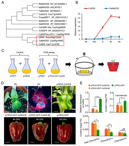 APA StyleSong, Y., Cheng, Q., Li, X., Ma, S., Shen, H., & Sun, L. (2025). The MADS-Box Transcription Factor CaRIN Positively Regulates Chlorophyll Degradation During Pepper (Capsicum annuum L.) Fruit Ripening by Repressing the Expression of CaLhcb-P4. Plants, 14(3), 445. https://doi.org/10.3390/plants14030445