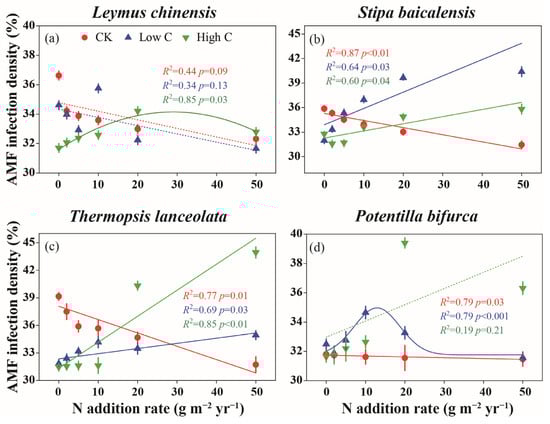 Effects of historical N enrichment and subsequent labile C addition on arbuscular mycorrhizal fungi (AMF) infection density of plant roots across different plant species. (a) L. chinensis (Trin. ex Bunge) Tzvelev (perennial rhizomatous grass); (b) S. baicalensis Roshev. (perennial bunchgrass); (c) T. lanceolata R. Br. (legume); (d) P. bifurca Linn. (forb). CK represents control treatment with only water added, while Low C and High C correspond to C addition levels of 200 and 2000 g C m−2 yr−1, respectively. Error bars represent ±SE (n = 8). Data were fitted using linear, polynomial or nonlinear curve fitting methods, selecting the most appropriate curve type for each C level.