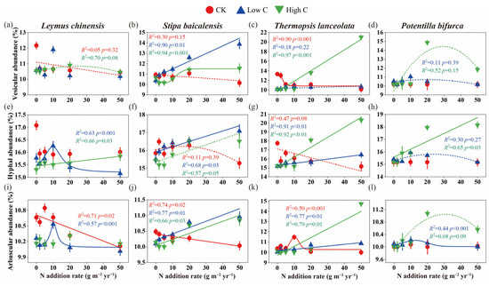 Vesicular, hyphal and arbuscular abundance exhibited species-specific responses to N and C treatments (Figure 2). L. chinensis showed a significant increase in vesicular abundance at the N10 level with low C addition, while under high-C conditions, vesicular abundance displayed a non-significant quadratic response with increasing N (Figure 2a). In contrast, S. baicalensis experienced significant increases in vesicular, hyphal and arbuscular abundance at higher N levels under both low- and high-C conditions (Figure 2b,f,j). For T. lanceolata and P. bifurca, high-C treatment significantly enhanced vesicular, hyphal and arbuscular abundance at higher N levels (Figure 2c,d,g,h,k,l).