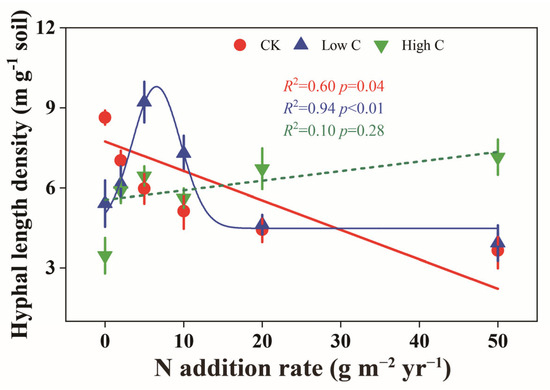 Effects of historical N enrichment and subsequent labile C addition on surface soil (0–10 cm) hyphal length density of arbuscular mycorrhizal fungi. CK represents control treatment with only water added, while Low C and High C correspond to carbon addition levels of 200 and 2000 g C m−2 yr−1, respectively. Error bars represent ±SE (n = 8). Data were fitted using linear, polynomial or nonlinear curve fitting methods, selecting the most appropriate curve type for each C level.