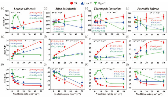Effects of historical N enrichment and subsequent labile C addition on root C, N and P stoichiometric ratios in different plant species. (a–d) Root C/P ratio; (e–h) Root N/P ratio; (i–l) Root C/N ratio. CK denotes control with only water added; Low C and High C correspond to carbon addition levels of 200 and 2000 g C m−2 yr−1, respectively. Error bars represent ±SE (n = 8). Data were fitted using linear, polynomial or nonlinear curve fitting methods, selecting the most suitable curve type for each C level.
