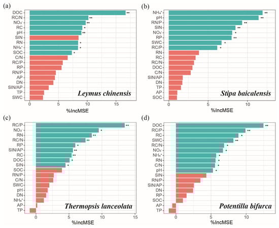 Importance of historical N enrichment and subsequent labile C addition in explaining variance in the first principal component (PC1) of AMF infection metrics across different plant species based on random forest analysis. The plant species represented are (a) L. chinensis (Trin. ex Bunge) Tzvelev, explaining 66.47% of the variance; (b) S. baicalensis Roshev., explaining 77.40% of the variance; (c) T. lanceolata R. Br., explaining 69.51% of the variance; and (d) P. bifurca Linn., explaining 74.48% of the variance. The importance of each variable is measured as the percentage increase in mean squared error (%IncMSE) when the variable is randomly permuted. NH4+ indicates soil NH4+-N; NO3− indicates soil NO3−-N; RC, RN, RP, RC/N, RC/P and RN/P represent root carbon, nitrogen, phosphorus content and their ratios; SIN refers to soil inorganic N; SOC indicates soil organic C; SWC indicates soil water content; DOC indicates soil dissolved organic C; DN indicates soil dissolved N; C/N represents the ratio of DOC to DN; AP indicates soil available P; TP indicates soil total P. Significant variables are marked with asterisks: * p < 0.05, ** p < 0.01.