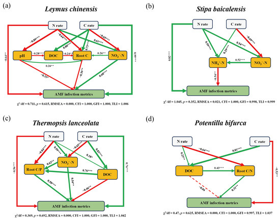 Structural equation models (SEMs) illustrating the relationships between N addition rates, C addition rates, key variables and the first principal component (PC1) of AMF infection metrics across different plant species. The models illustrate the direct and indirect effects of N and C addition on AMF infection metrics through selected variables. (a) L. chinensis (Trin. ex Bunge) Tzvelev: PC1 explains 66.47% of the variance; (b) S. baicalensis Roshev.: PC1 explains 77.40% of the variance; (c) T. lanceolata R. Br.: PC1 explains 69.51% of the variance; (d) P. bifurca Linn.: PC1 explains 74.48% of the variance. Path coefficients are indicated on each arrow. Green solid lines represent significant positive correlations, while red solid lines represent significant negative correlations (p < 0.05). Dotted lines represent non-significant relationships (p > 0.05). The thickness of the lines corresponds to the strength of the relationship. Model fit indices at the bottom of each panel indicate a good fit for each SEM (e.g., χ2/df, RMSEA, CFI, GFI, TLI). NH4+-N indicates soil NH4+-N; NO3−-N indicates soil NO3−-N; Root C, Root C/N and Root C/P represent root C, the ratio of root C and N and the ratio of root C and P; DOC indicates soil dissolved organic C. Significance levels are indicated as follows: * p < 0.05, ** p < 0.01, *** p < 0.001.