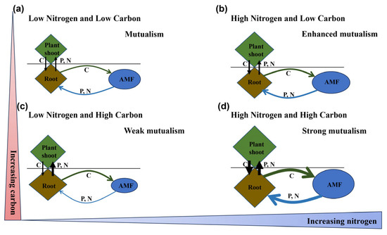 Diagram illustrating the effects of historical N enrichment and C addition on AMF symbiosis. (a) Low historical N and low C: A mutualistic symbiosis between host plants and AMF is established through balanced nutrient exchange. Host plants provide C to AMF in exchange for essential minerals. (b) High N and low C: Phosphorus becomes limited due to N accumulation. Plants increasingly rely on AMF for P, thereby strengthening the mutualistic relationship. (c) The addition of sucrose allowed the plants to increase the amount of carbon transported to the AMF through the mycorrhizal interface without being constrained by the resource of soil nutrients and the relationship became a weak mutualism. (d) High N and high C: While nitrogen is abundant, increased C input reduces N availability and exacerbates P limitation. This fosters a strong mutualistic relationship, with AMF playing a crucial role in plant nutrient acquisition. Figure adapted from Ma et al. [13].