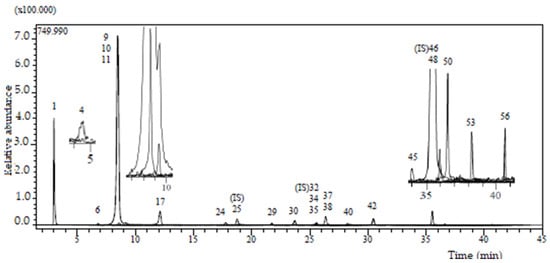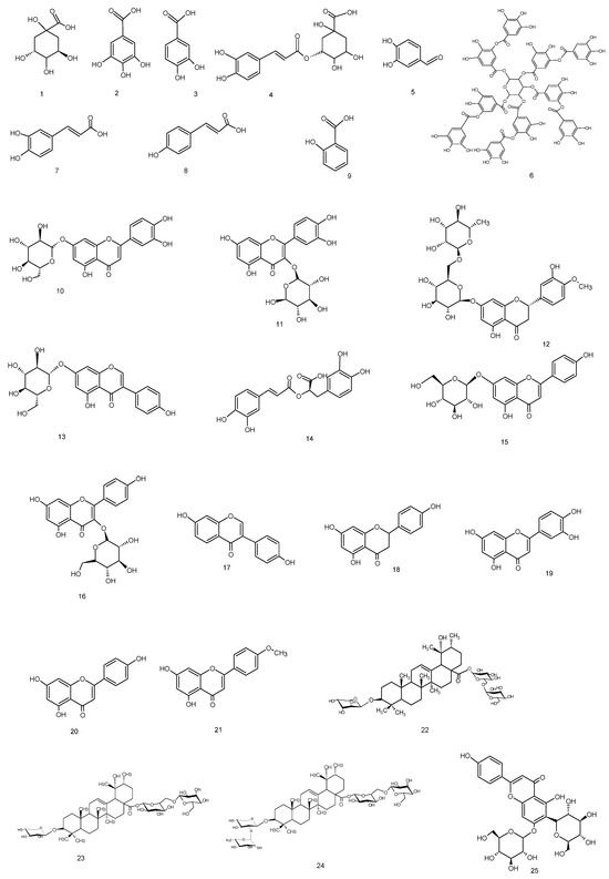 The analysis confirmed that the methanolic extract contained five phenolic acids, four flavonoid glycosides, four flavonoid aglycones (flavones), two caffeic acid esters, an organic acid, a phenolic aldehyde, a polyphenol, an isoflavone, an isoflavone glycoside, and a flavanone glycoside. It was determined that the extract contained the highest quantities of quinic acid (8.094 mg/g) and chlorogenic acid (4.749 mg/g) among the 53 standard compounds. The other components were present in medium to low amounts. Chlorogenic acid is produced by the esterification of caffeic acid and quinic acid.