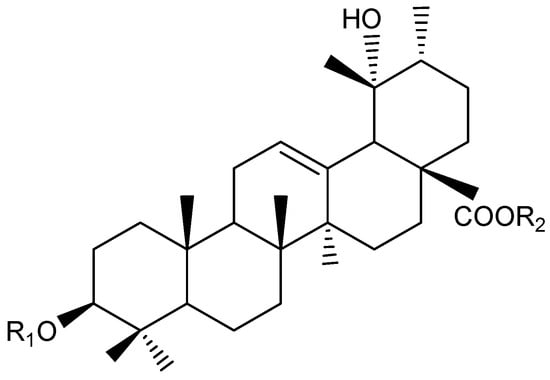 Ursane-type saponins structure (22, 23, 24) from Knautia integrifolia. Compound 22: R1 = Ara, R2 = All (1 → 6) Glc, Compound 23: R1 = Xyl, R2 = All (1 → 6) Glc, Compound 24: R1 = Rha (1 → 2) Ara, R2 = All (1 → 6) Glc.